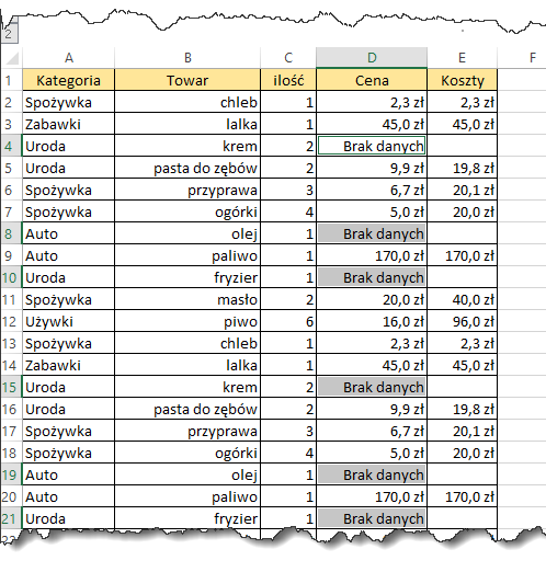 Mamy taki zestaw danych, gdzie w kolumnie D mamy kilka pustych komórek, oraz kilka komórek, które zawierają formuły.